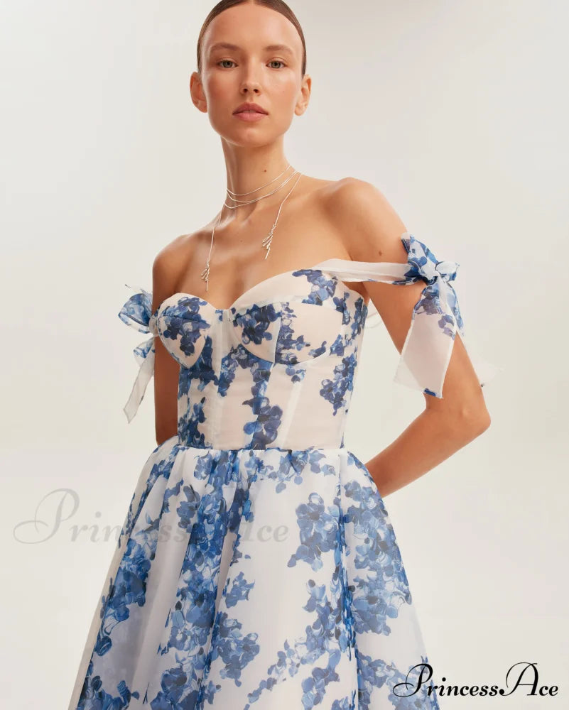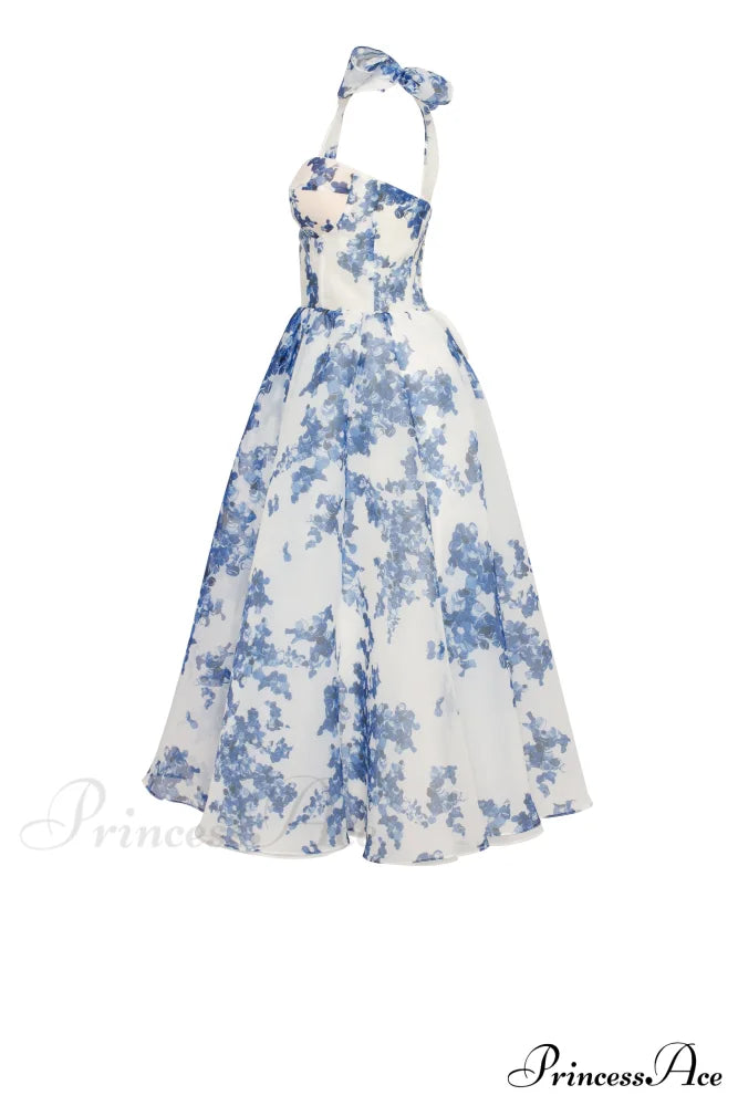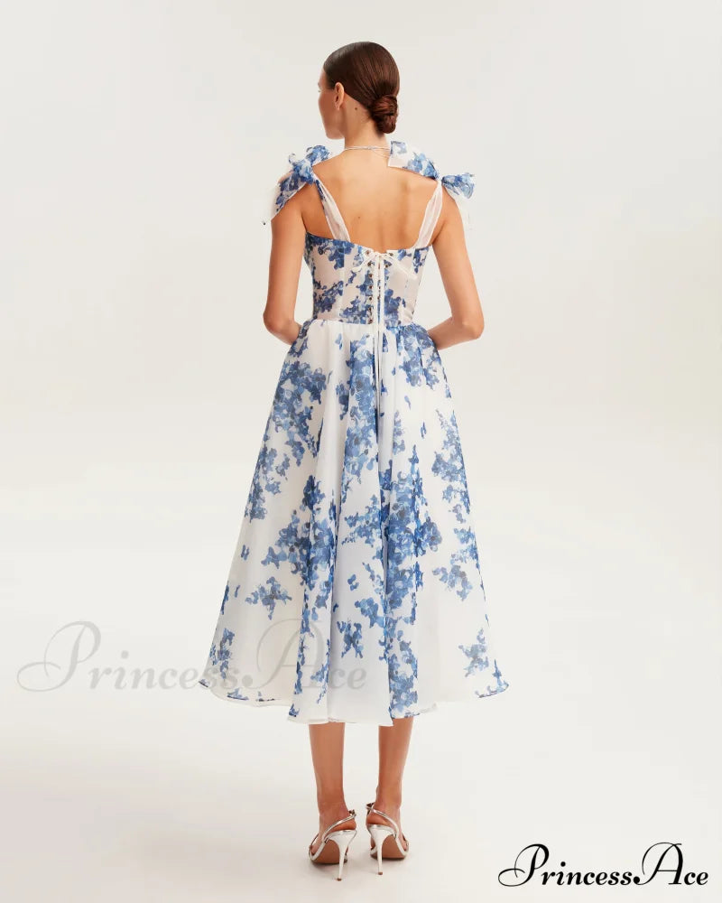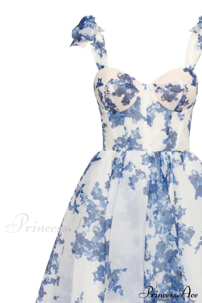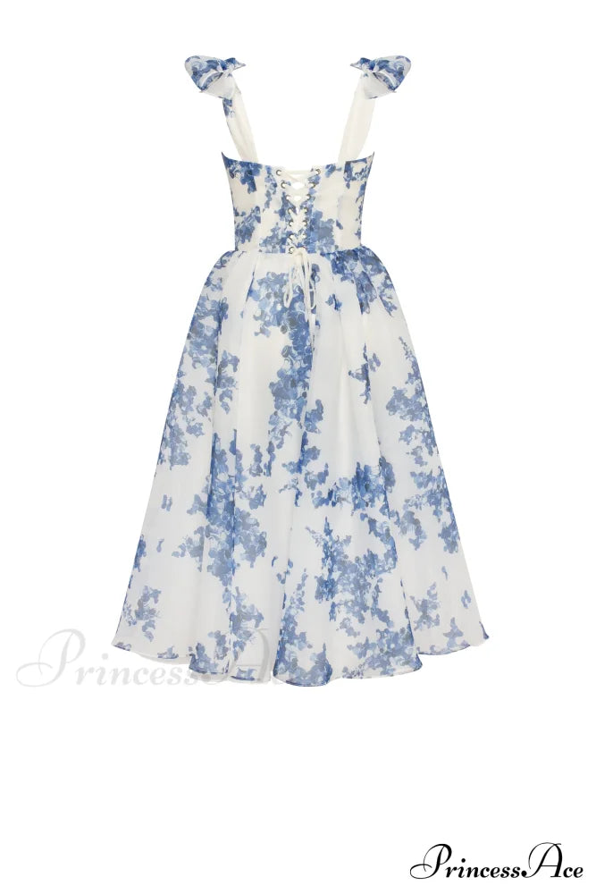 This charming midi dress features a delightful blue-navy floral design, crafted from lightweight organza. It showcases a snug heart-shaped bodice adorned with bow straps, a corset-style back, and a gracefully flared midi-length skirt. When you put on this dress, you'll experience an enchanting sense of elegance and confidence that will make you feel truly special.