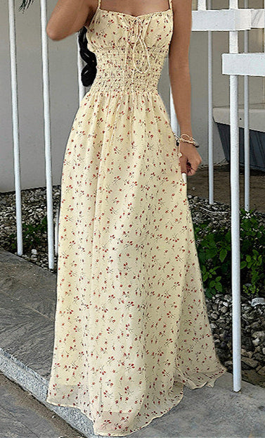 Sexy Smocked V Neck High Waist A Line Maxi Cami Floral Dress