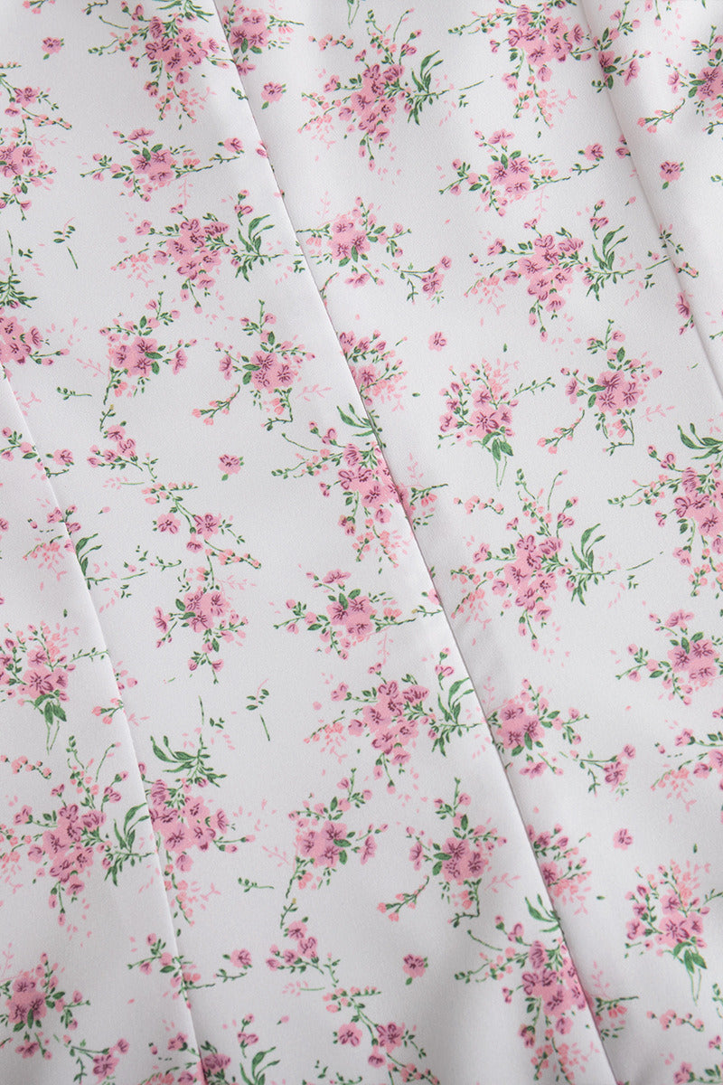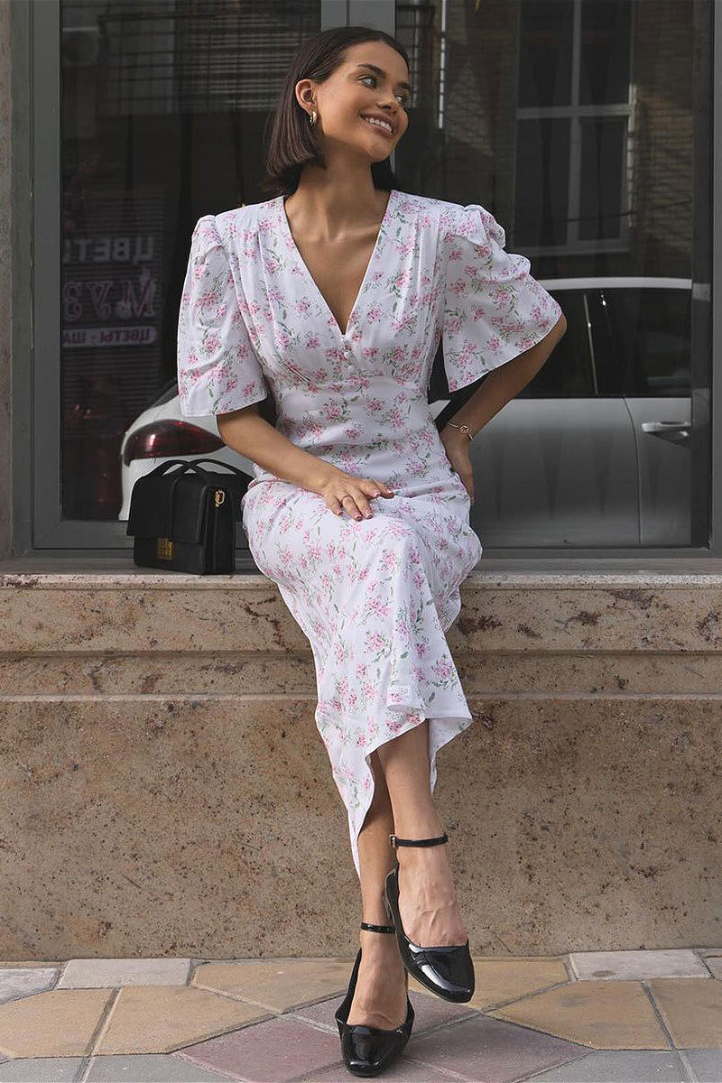 V Neck Fitted Shoulder High Waist Short Sleeve Floral Dress